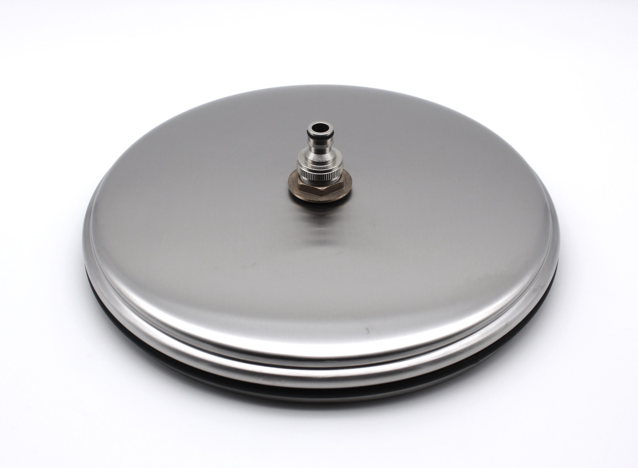 Für die Nass-Siebung wird ein spezieller Siebdeckel mit Brause- / Sprüh-Vorrischtung verwendet, sodass während der Siebung stetig Wasser durch den Siebturm gesprüht werden kann. Blau-Metall bietet diesen Siebdeckel mit zwei verschiedenen Schlauchanschlüssen – eine konventionelle 3/4-Zoll Schlauchverschraubung mit 14 mm Tülle and die der Schlauch mittels Schlauchschelle befestigt wird, oder einen 3/4-Zoll Schnellanschluss der mit den meisten Gartenschlauch-Anschlüssen kompatibel ist.